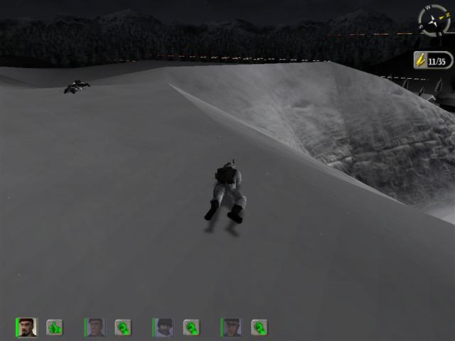You're not ready for that part yet - you've got some other business that has to be taken care of first - but you might as well go ahead and position your men where you're going to need them. Put your machine gunner and the men with the submachine guns up on that high snowy hump where they can cover that rock outcrop, but lying down so they're not exposed to return fire. Give them Guard on that rock ramp. Leave them there; it's not yet time for them to come on - but the bad guys are a little bit unpredictable in this mission, so you want that area covered just in case somebody forgets the script and comes up that ramp early.